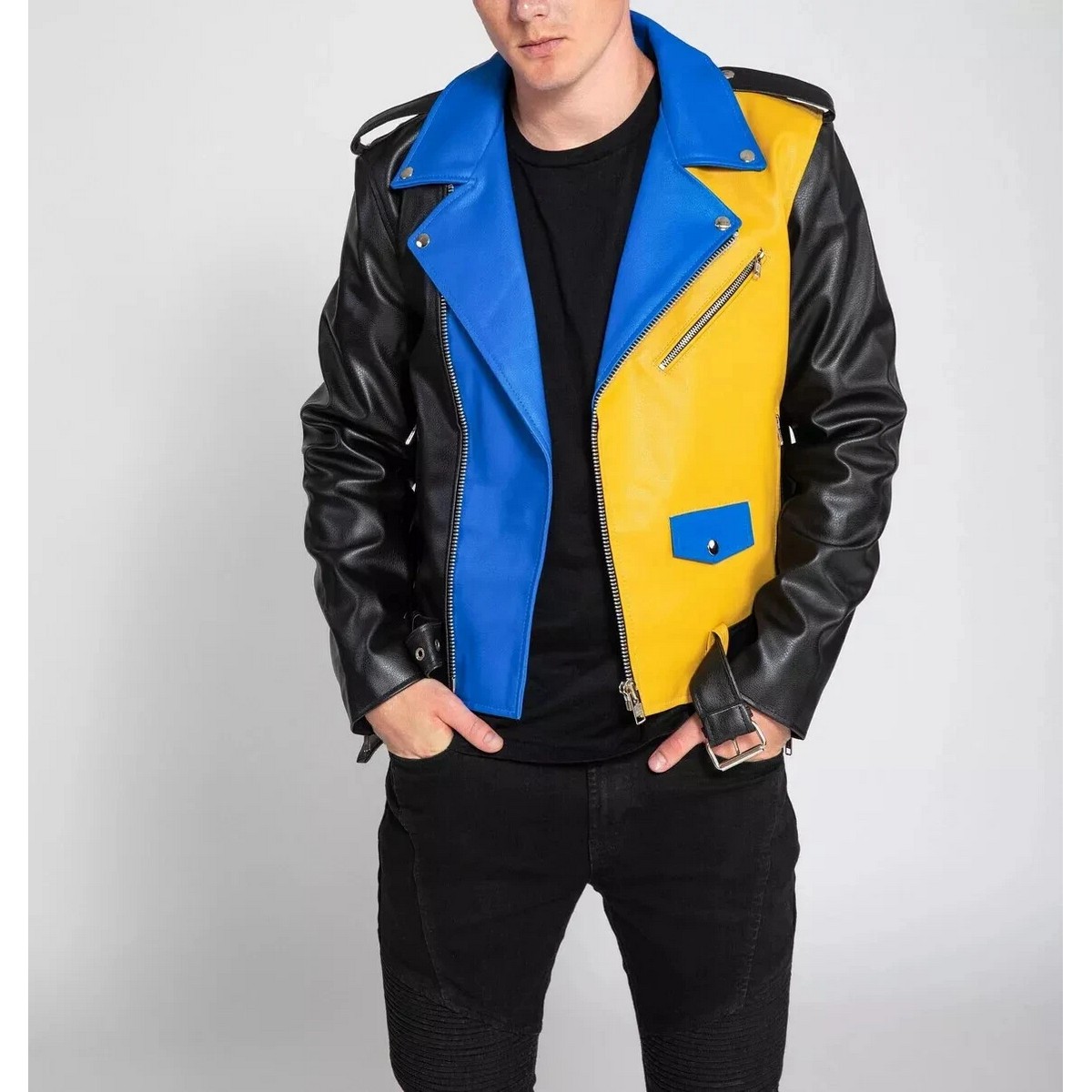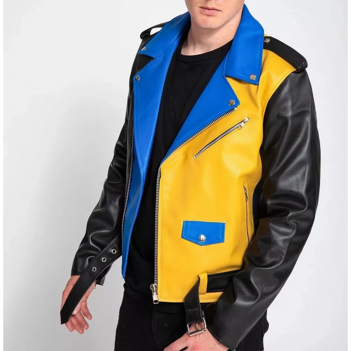 Zafy Leather Men's Black and Yellow Denim Trucker Lambskin Leather Jacket