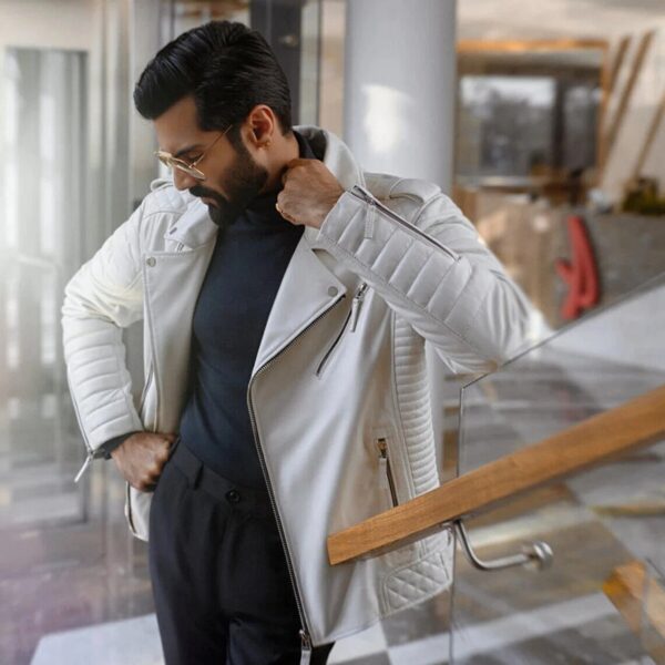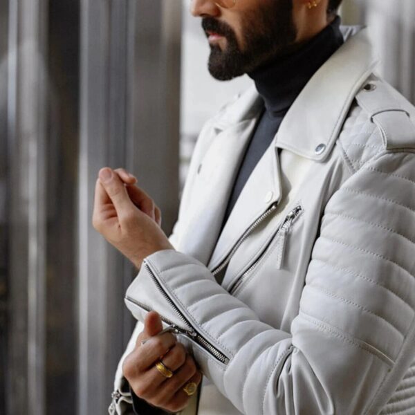 Let your inner rebel out with this striking White Biker Leather Jacket for Men, made from supple Lambskin Leather. Featuring a sleek straight hemline, satin lining, and a durable YKK Zip Closure, this Biker Leather Jacket blends toughness with style. The quilted shoulders with stylish snap-button straps to elevate your look. Custom-fit options are available to suit your needs. Get FREE DELIVERY worldwide. Order now and redefine your wardrobe!